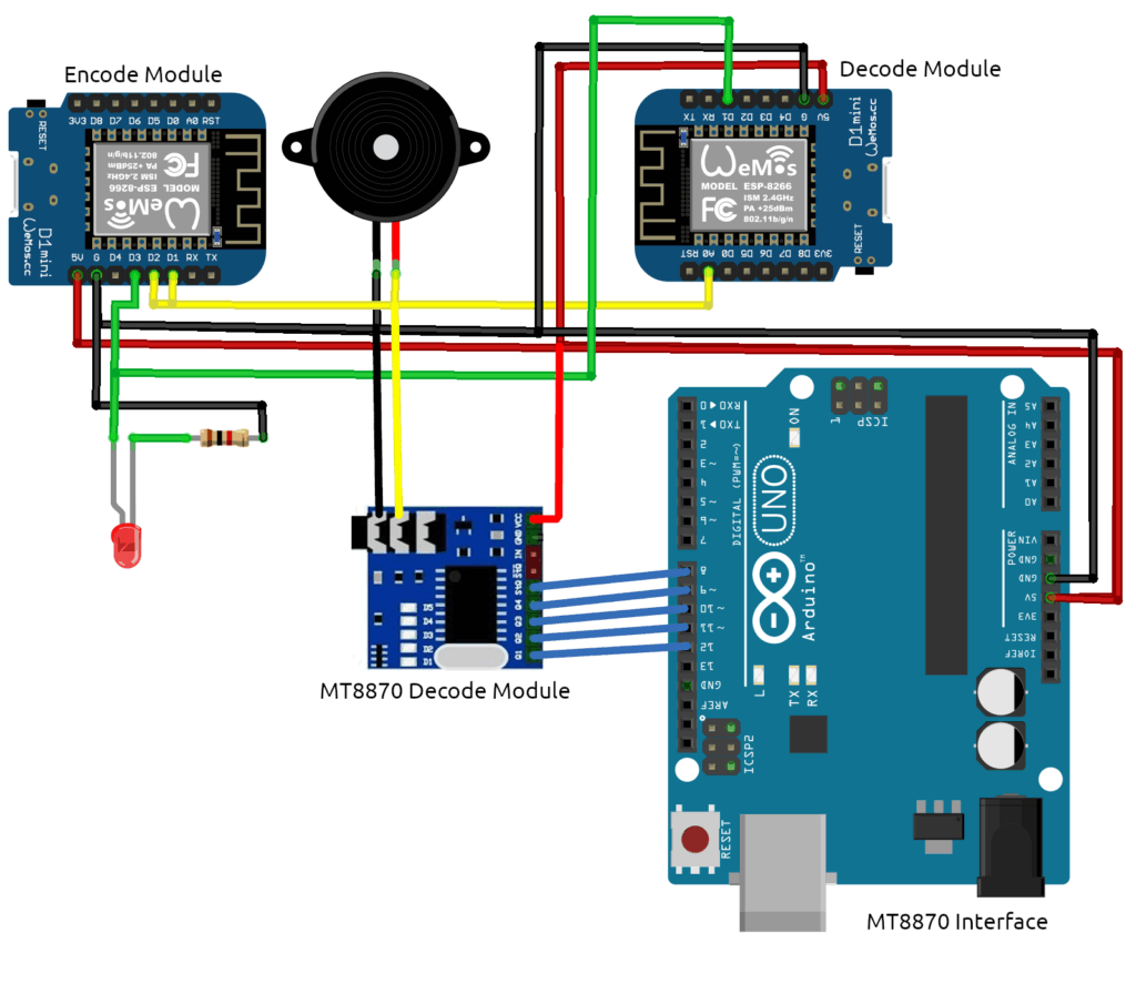 The Encode Module will be the signal source for the Decoding modules. I’ve included a MT8870 Decode module as well as an Arduino Uno to highlight the simplicity of the ESP8266 Decode module.
