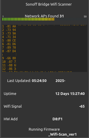 This post will cover how to use the Sonoff RF Bridge hardware as a wifi scanner and display its results in Node Red. Here is a high level view of what will be covered. The hardware is an IoT device intended as a gateway between 433 Mhz sensors and a wifi network. That purpose will be abandoned. Instead the device will be modified to allow it to be programmed using a serial to usb converter. With that, firmware will be created and loaded on the device. This firmware will define its new use. It will scan for wireless networks that broadcast within its range. The results will be stored in its memory. The device will connect to its wifi network and publish the results to a mqtt broker. Afterward it will disconnect and repeat this cycle until its powered off. Node Red will be used as a front end to display the scan results. It will subscribe to the mqtt broker. As data arrives from the broker, it will format the results and display them on the dashboard.