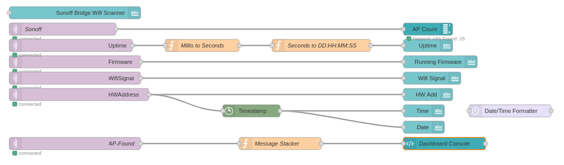 With a usable version installed on the device, it should start scan and publish its results. These results can now be processed with Node Red along with other information about the device.
